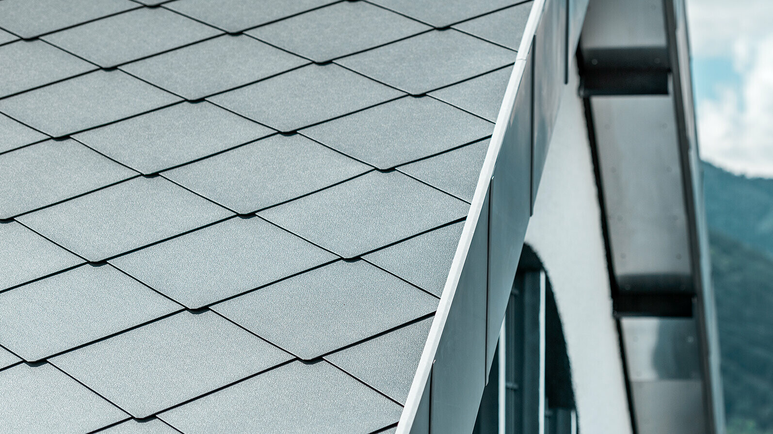 All'esterno, la casa vacanze appare quasi industriale con il suo involucro grigio e spigoloso, ma nei dettagli e anche all'interno si punta sull'impiego del legno come materiale visibile. Il tetto e la facciata sono coperti da scaglie 44 × 44 in P.10 grigio chiaro. È soprattutto qui, nella seconda casa, che la famiglia ha optato per un materiale durevole e a bassa manutenzione.